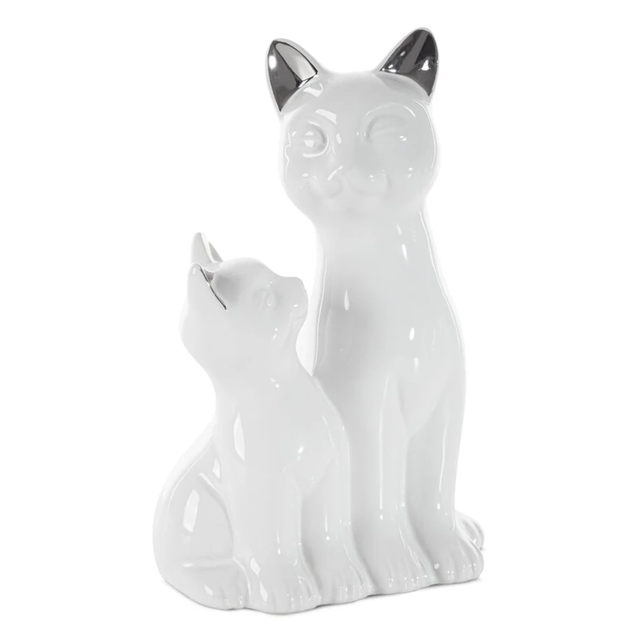 Módot keres nappalija elrendezésének változatosabbá tételére? Egy macska – egy kerámia figura , amely biztosan tetszeni fog ezeknek a bájos lényeknek a rajongóinak – tökéletes lesz erre a szerepre . Dekoratív fehér színű, ezüst ékezetes figura , amely két nőstény macskát és egy kis cicát ábrázol . Kiválóan alkalmas belső dekorációra, kiemelve az elrendezés karakterét és rendkívül hangulatos légkört teremtve. Ez a részlet egyben eredeti ajándékötlet is. Tekintse meg kínálatunk többi figuráját is, és alkossa meg saját macskakollekcióját!