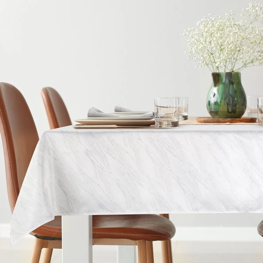 A SUZANA terítő az elegancia, a kifinomultság és a praktikum ötvözete. A fehér háttérszín fényességet és finomságot kölcsönöz, miközben semleges alapot biztosít a szemet gyönyörködtető mintához. Az ezüst márvány minta fényűző karaktert és finom fényt kölcsönöz neki, amely egyedi hangulatot kölcsönöz minden asztalnak. Ezenkívül a foltálló tulajdonsága rendkívül praktikussá teszi a terítő használatát. Megvéd a véletlen szennyeződésektől, így könnyebben tisztán tartható. Ideális megoldás mindennapi étkezésekre és különleges alkalmakra egyaránt, biztosítva az esztétikát és a funkcionalitást, anélkül, hogy aggódnia kellene az esetleges foltok miatt.