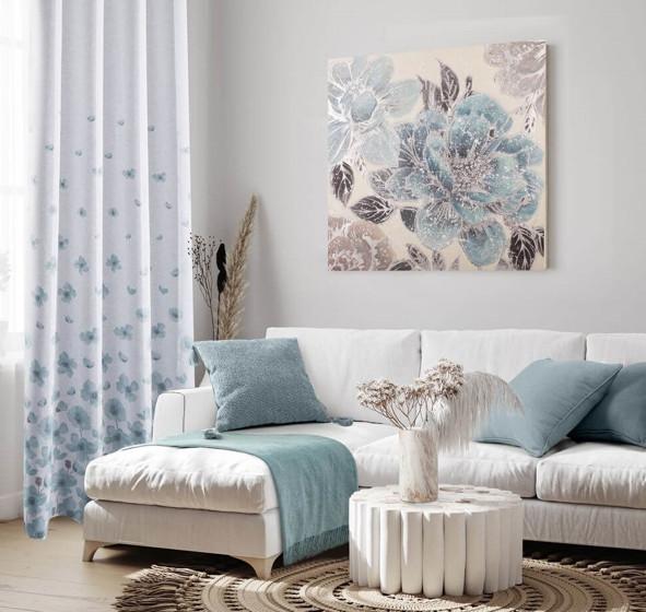 A függönyök stílusos akcentussá válhatnak, amely kiemeli a belső tér karakterét. Ezt a hatást a világos etaminból készült, pasztell virágmintás függöny hozza létre . A finom kék virágok rendkívül finom mintája könnyűvé és frissé teszi a helyiséget. A részletekre való odafigyeléssel kialakított dekoráció tökéletes kiegészítője lesz egy romantikus stílusú elrendezésnek.
