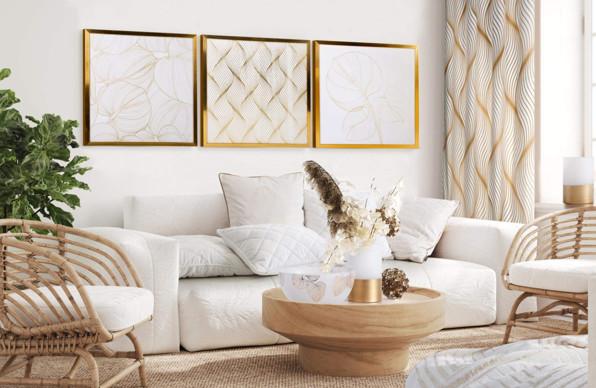 Azonban néha a túl világos elrendezések kissé hidegnek vagy monotonnak tűnhetnek. Hogyan lehet tehát életre kelteni egy ilyen nappalit, hogy karaktert és melegséget biztosítson? A siker kulcsa az arany kiegészítők, a gondosan válogatott festmények és a fa elemek. Az arany elemekkel díszített festmények vagy függönyök rejtett fényt kölcsönöznek a belső térnek, míg a fából készült bútorok vagy kiegészítők melegséget és otthonosságot kölcsönöznek. A természetes fa textúrája és színe megtöri a világos belső terek hűvös karakterét, mélységet adva bennük. A világos ülőgarnitúrákat divatos motívumokkal, fodrokkal vagy bohó stílusú elegáns párnákkal kell élénkíteni.