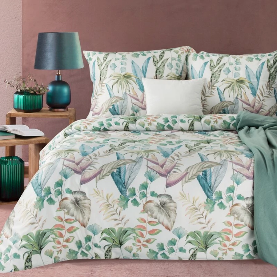 Csodálkozzon el az ELLA LINE kollekció ágyneműje, mely finom szaténszövésű anyagból készült, színes egzotikus levelek motívumával díszített nyomattal ! A kellemes tapintású anyag pamut és poliészter szálak keverékéből áll . Ez az összetétel garantálja az ágynemű hosszabb élettartamát, megkönnyítve a gondozását és kellemes vasalását. A pamut könnyedsége és felületének határozott csillogása a hőkomfort érzetét kelti, és gyengéden beburkol. Divatos botanikai levélmotívum színes színekben kiemelkedik az anyag kontrasztos fehér hátterén. Az innovatív festési technika azt jelenti, hogy a színek még sok mosás után sem fakulnak ki , a párnákba és a paplanhuzatba varrt cipzárak pedig gyors és problémamentes ágyneműcserét biztosítanak.