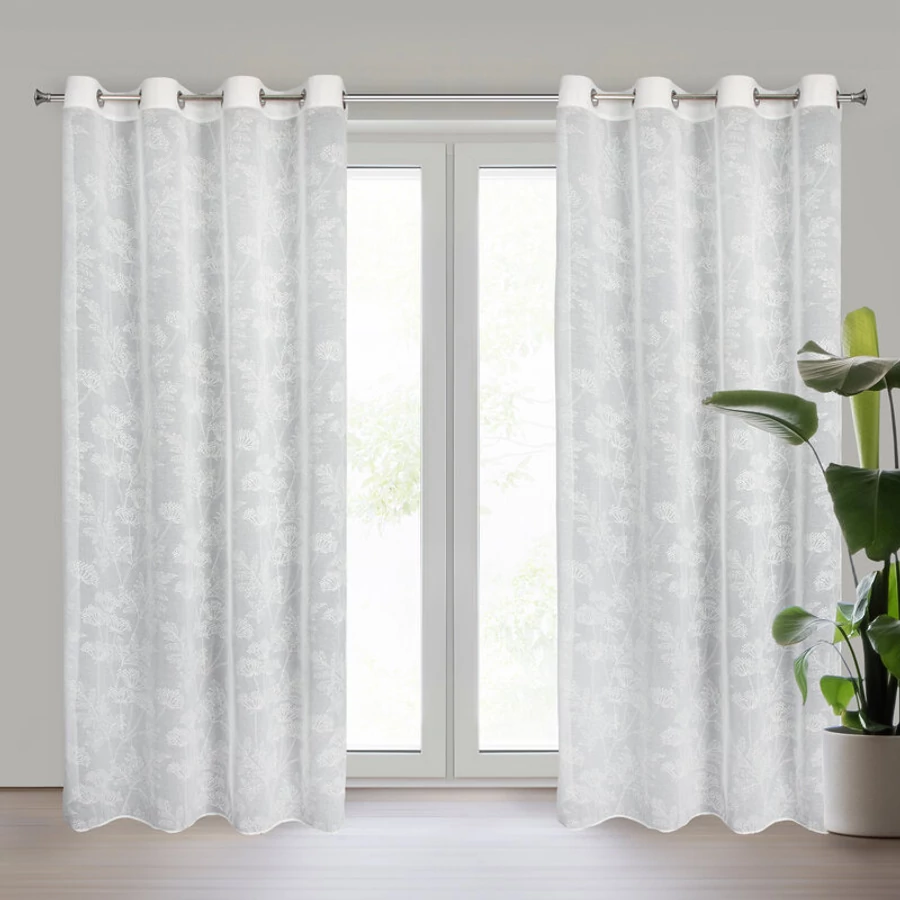 A sajtszövetből készült kész függöny egyedülálló módja annak, hogy finom, mégis elegáns akcentust vigyünk be a belső térbe. A könnyedségével és átlátszóságával jellemezhető sajtkendő átengedi a fényt, így a helyiség világosabbnak és tágasabbnak tűnik . A habszivacs virágminta finom fényt ad, és dekoratív, kifinomult megjelenést kölcsönöz az anyagnak. A virágmotívumok természetes, romantikus hangulatot hoznak a belső térbe, így ez az ablakdísz egyaránt alkalmas klasszikus és modern elrendezéshez, kiemelve azok stílusát és eleganciáját. A széles fűzőlyukak rendszere lehetővé teszi a függöny gyors és kényelmes rögzítését a függönyrúdhoz.