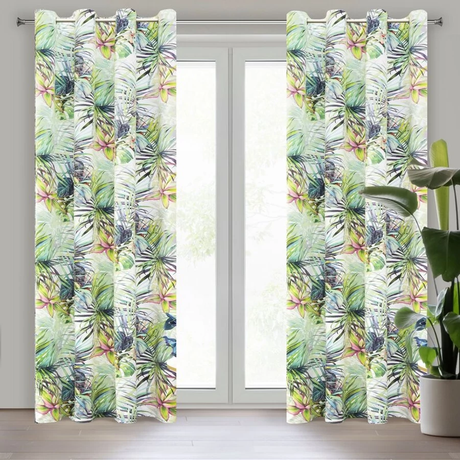 Íme a javaslatunk egy gyors belső felfrissítéshez - a puha és kellemes tapintású bársonyszövet fehér alapon színes egzotikus levelekkel nyomott függöny olyan kiegészítő, amely tökéletesen passzol a divatos, modern elrendezésekhez. A kontrasztos fehér alapon elhelyezett színes levelek és virágok rendkívül színes kompozíciót hoznak létre a modern enteriőrök számára a botanikai vagy városi dzsungel stílusában . Könnyedén függönyrúdra akaszthatod - ehhez praktikus fűzőlyukak vannak , amelyeknek köszönhetően a függönycsere gyors és egyszerű, az anyag pedig puha és szabályos hullámokat képez a felakasztás után. A vastagabb szövet tökéletesen elszigeteli a napfényt, kellemes beltéri klímát biztosítva.